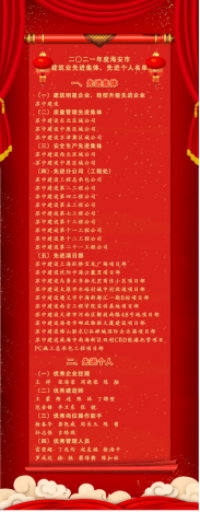 2月10日,“建筑之鄉”海安召開全市建筑業發展工作會議,動員全市建筑領域提振精神再出發,攻堅突破再跨越,持續推動海安建筑業高質量發展走在前列。會議集中表彰了2021年度全市建筑業先進集體和先進個人,蘇中建設榮獲“建筑明星企業”和“轉型升級先進企業”稱號,5個區域公司、9個工程公司、10個項目部和34名蘇中人受到表彰。